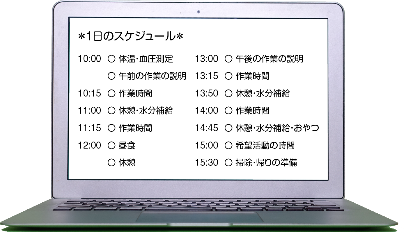 「就労継続支援B型 たんた」では、次のサービスを提供しています。